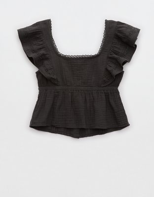 The Details Soft & breathable woven cottonSquare neck with functional buttons down frontFlutter sleevesCrochet & lace trim deetsElastic backAccessibility deets: over-the-head...