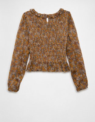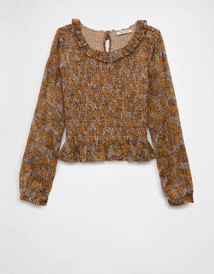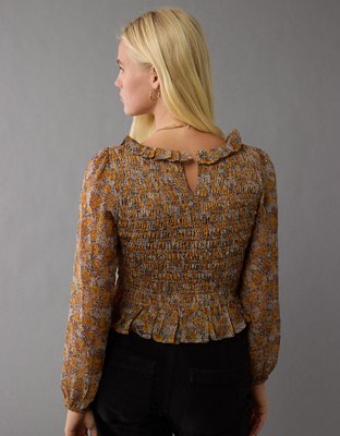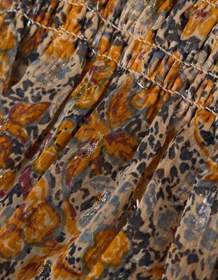 The Details Lightweight chiffon fabricHigh neckSmocked bodiceFloral printRuffle hemSlight balloon sleeve Materials & Care 96% Recycled Polyester 4% MetallicMachine washImported...