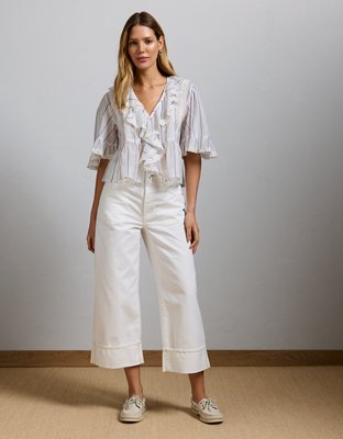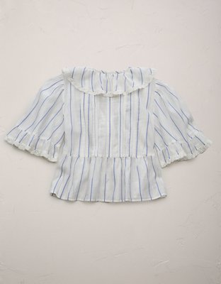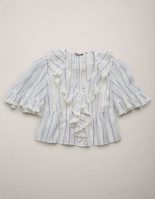 The Details Striped dyed yarnRuffles lined with lacePintucks at front & backGathered sleeve cuff & body Materials & Care 75% Cotton 25% SilkDry cleaImported Size & Fit Relaxed fit