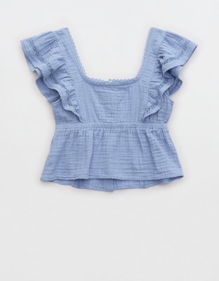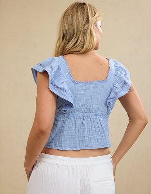 The Details Soft & breathable woven cottonSquare neck with functional buttons down frontFlutter sleevesCrochet & lace trim deetsElastic backAccessibility deets: over-the-head...