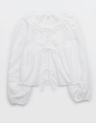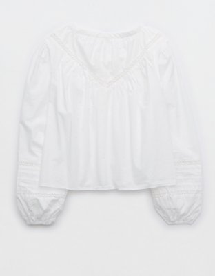 The Details Lightweight woven poplin fabricCrochet lace deetsBalloon sleeves with elastic cuffsPleat deets on the sleeves and chest Materials & Care 100% CottonMachine...