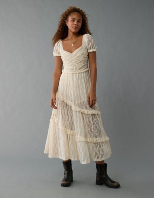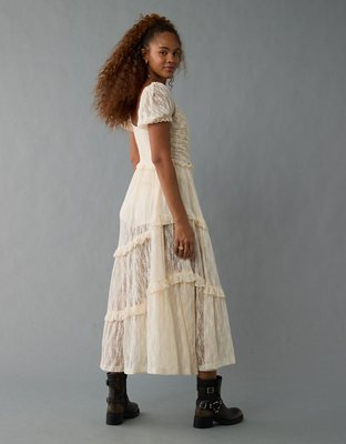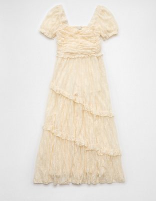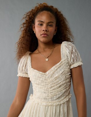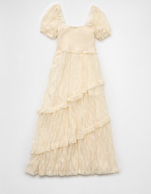 The Details Puff sleevesCinched sweetheart neckCinched bodiceAsymmetrical tiered skirtLace throughout Materials & Care 94% Nylon 6% ElastaneMachine washImported Size & Fit Fit &...
