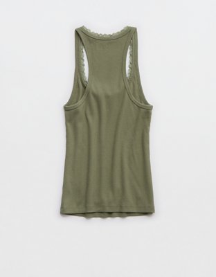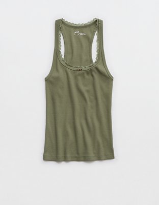 The Details Soft textural ribbed fabricRacerbackRibbed trim on neck and armholesRosette lace deets for a femme twistAccessibility deets: tagless design and over-the-head access...