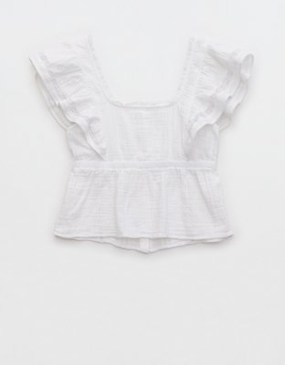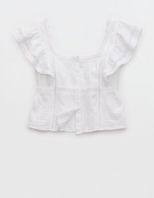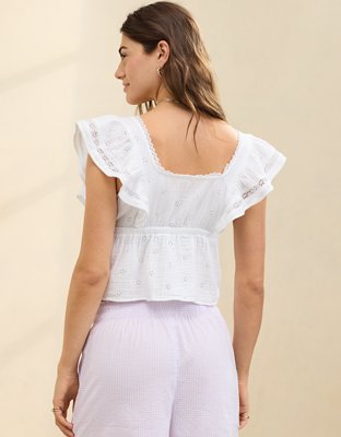 The Details Soft & breathable woven cottonSquare neck with functional buttons down frontFlutter sleevesCrochet lace & eyelet deetsElastic backAccessibility deets: over-the-head...