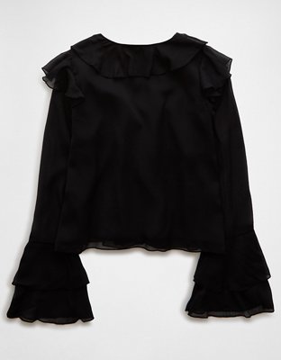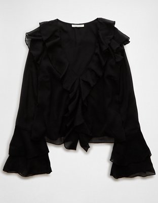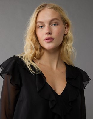 The Details Chiffon fabricV-neckRuffle details throughoutRuffle sleeves Materials & Care 100% PolyesterMachine washImported Size & Fit Classic fit & lengthLong sleeves