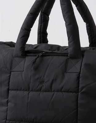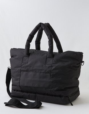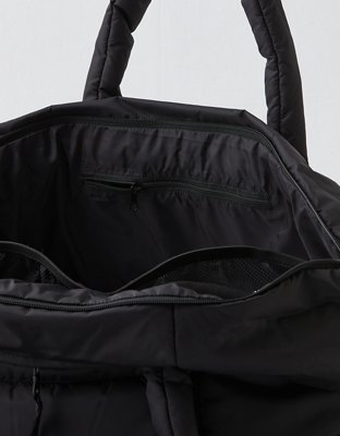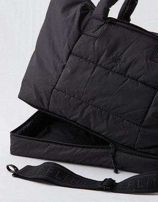 The Details THE LOOK: Lightweight puffy fabric that feels like a cloud (AKA bag of our dreams). Adjustable strap with logo & a band to slide onto a suitcase (here you come travel...