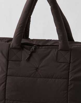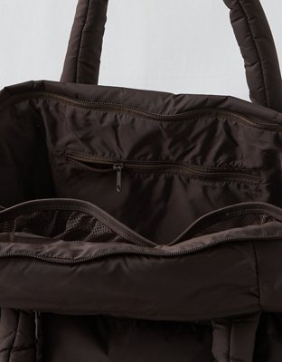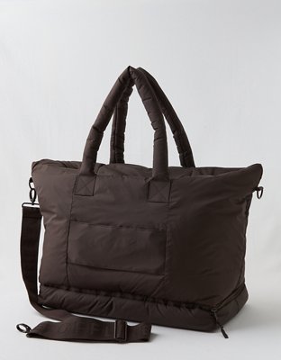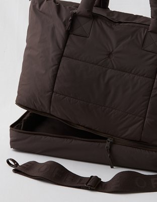 • THE LOOK: Lightweight puffy fabric that feels like a cloud (AKA bag of our dreams). Adjustable strap with logo & a band to slide onto a suitcase (here you come travel days)!