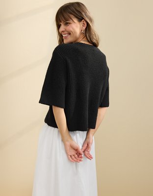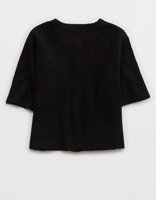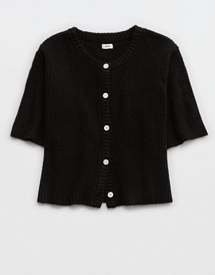 The Details The best of both worlds! unREAL sweater fabric is super cozy AND breathable.CrewneckShort sleevesCardigan with functional buttonsRibbed stitch deets Materials & Care...