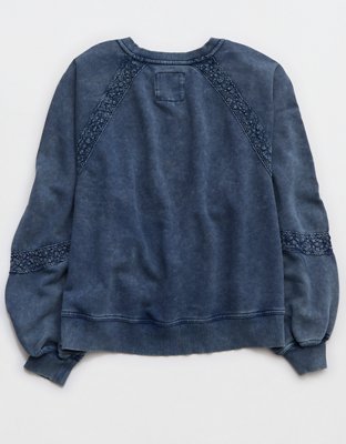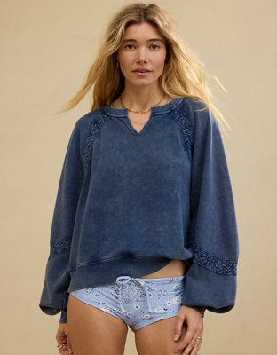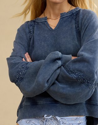 The Details Real Good Everyday FleeceNotch neckBalloon sleeves and crochet inset deets on sides and sleevesRibbed trim on neck cuffs and hemAccessibility deets: over-the-head...